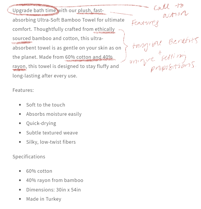 The product description for the bath towels focuses on resonating with environmentally conscious customers, who value durability. It highlights the rug’s tangible benefits: 60% cotton, 40% rayon, and ethically sourced. While, the features of the rug are as follows: gentle on the skin, absorbent, and long-lasting.